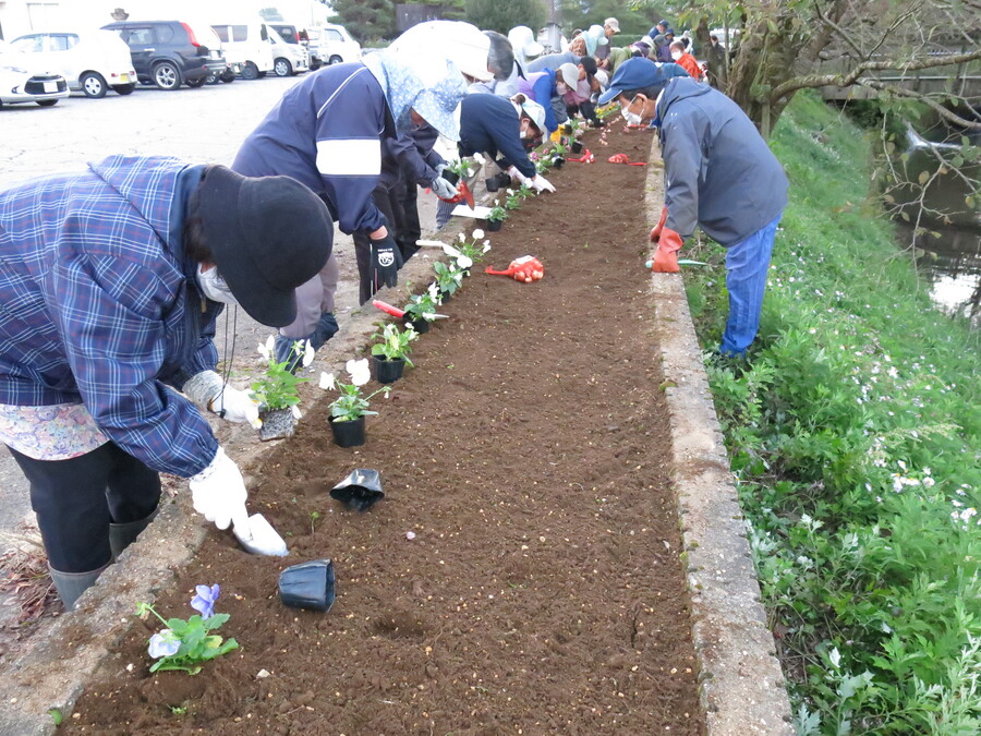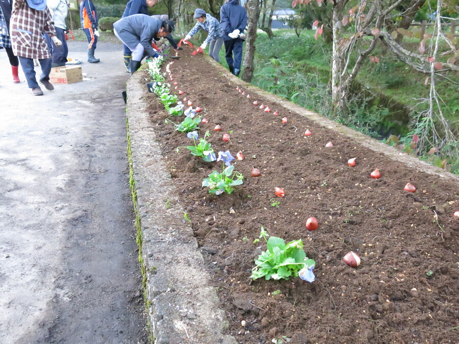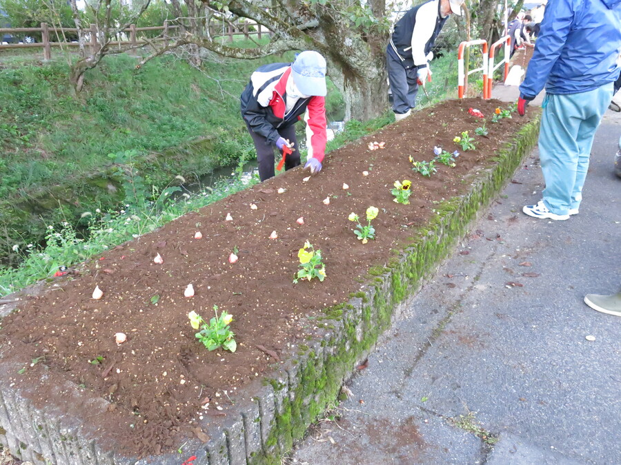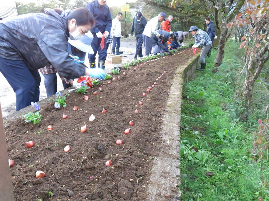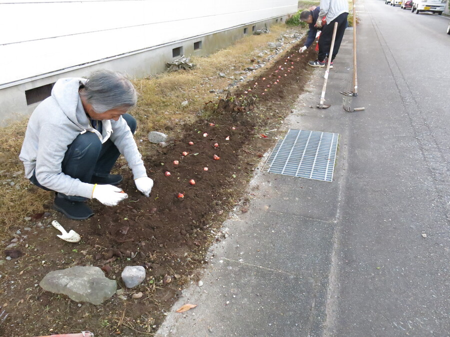 今回「赤」「桃」「赤・黄」の3種類のチューリップ球根を、交流センターのプランターや駐車場横の花壇、各町内会の花壇・プランターに植栽しました。