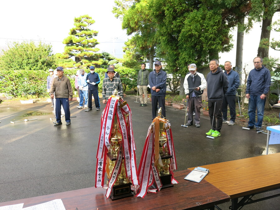 マレットゴルフ大会は天候が危ぶまれましたがどうにか小雨で持ちこたえ、12組(各町内2チーム)51名が参加し、12ホール同時スタートとなりました。