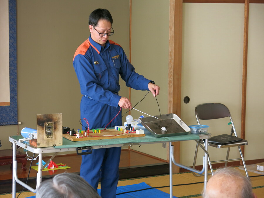 講師は、南砺消防署東分署の消防指令 寺脇政嗣氏にお願いし、『電気火災の原因と対策について』実演を交えて詳しく教えて頂きました。